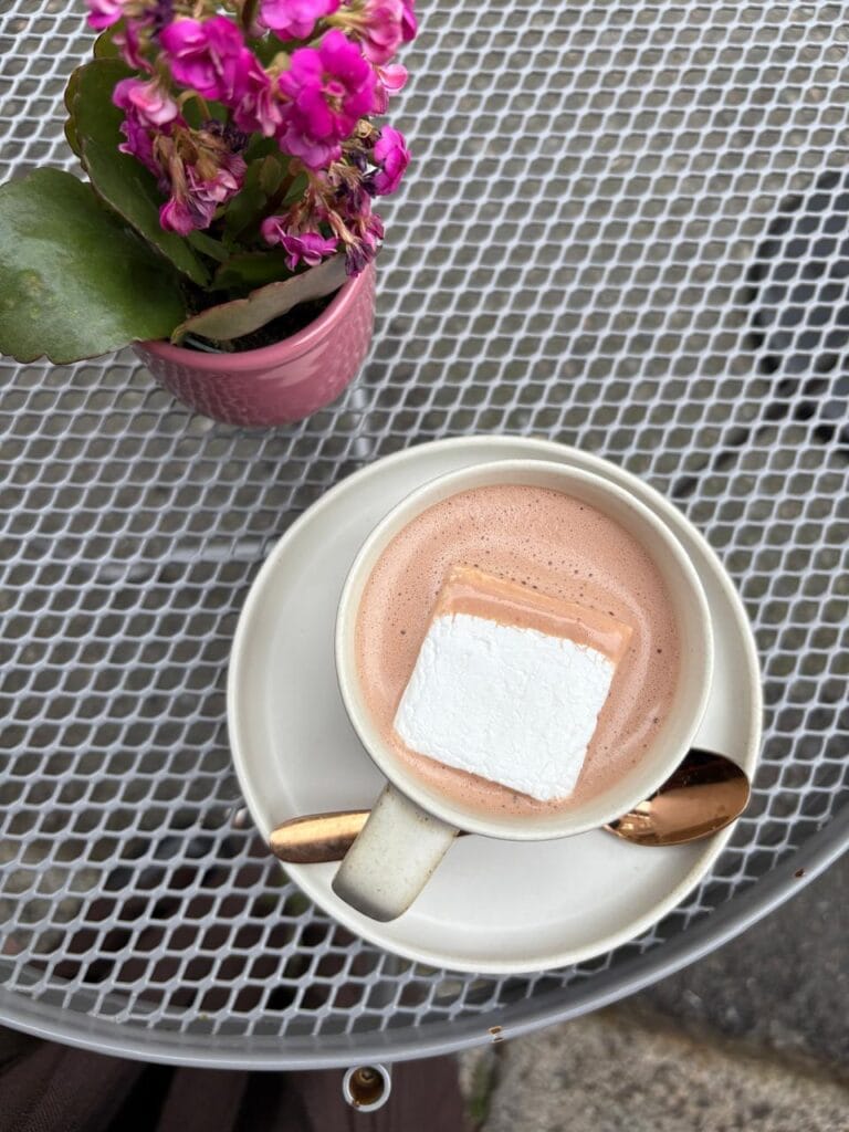 Lá também é possível tomar chocolate quente escolhendo a origem do cacau. Optei por um 60% com marshmallow — e a experiência valeu cada gole.